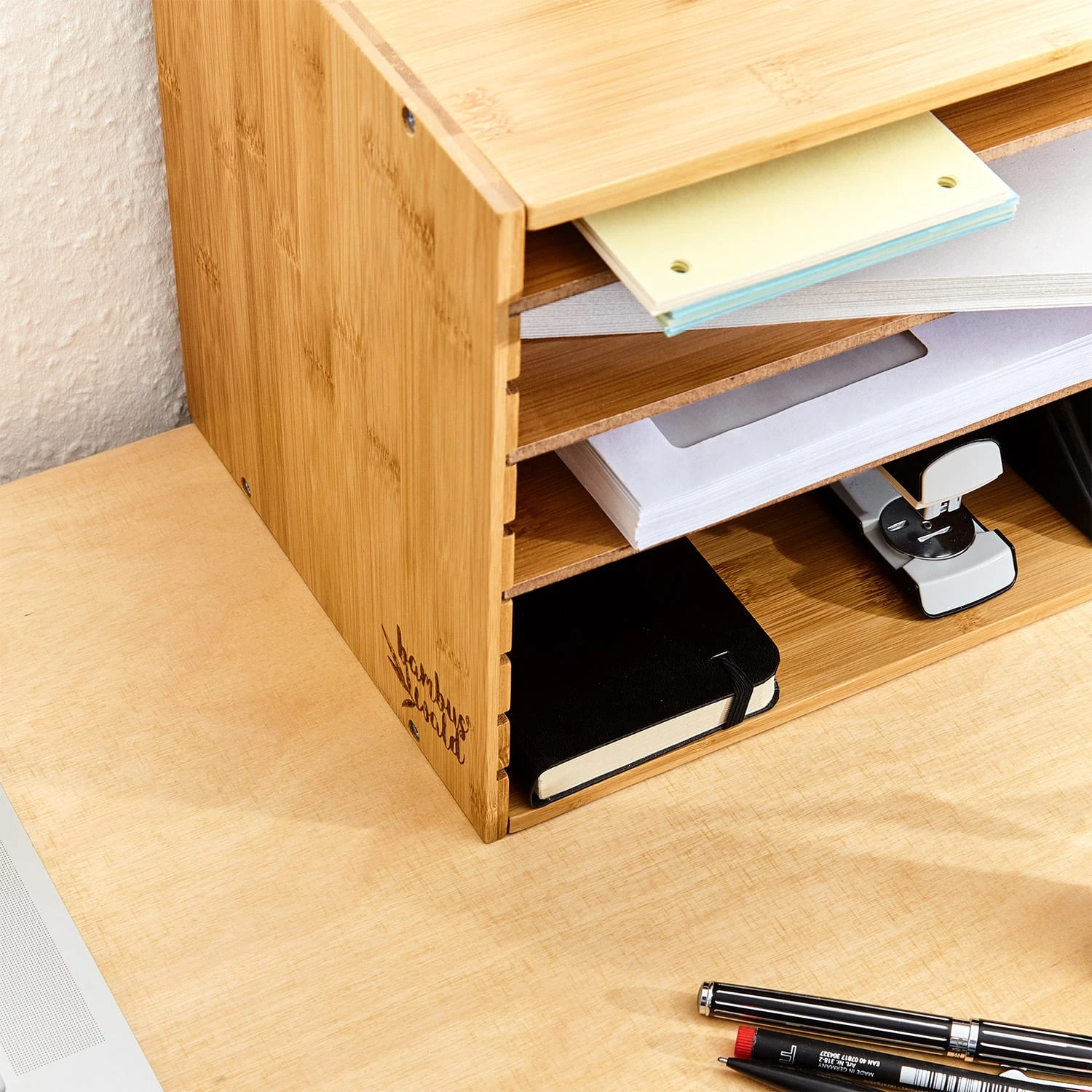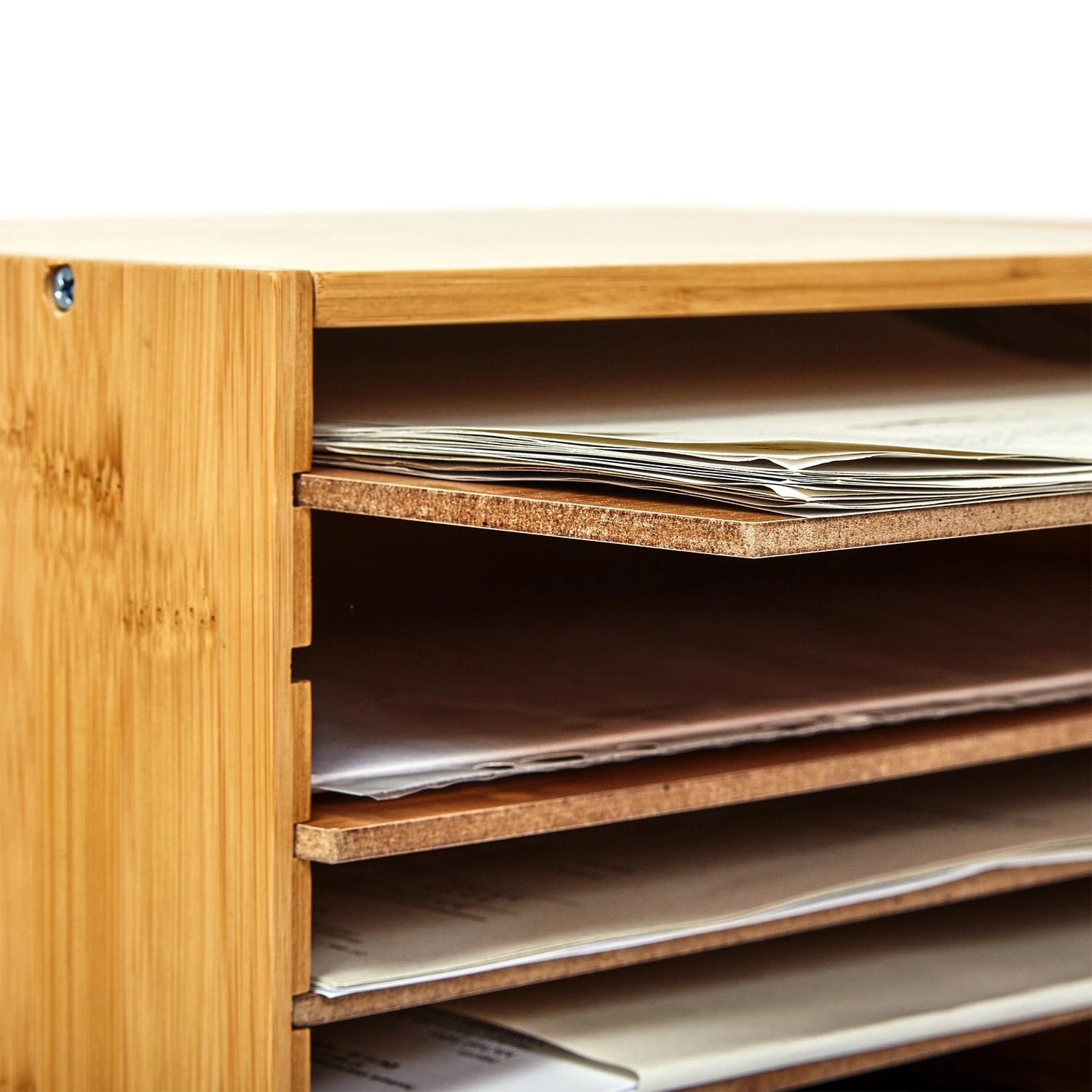 Willkommen auf deinem neuen Schreibtisch: Übersichtlich und ordentlich sortiert sind Briefe, Dokumente und Notizen in der modernen und praktischen Ablagebox von blumfeldt. Die Box ist platzsparend und bietet dennoch Raum für eine Menge Dokumente. Die Ablageböden kannst du ganz einfach in die vorgesehenen Schlitze einschieben. Der Ablagekasten verfügt über insgesamt 8 Stück davon. So kannst du also die Höhe der Ablageflächen selbst aus variablen Möglichkeiten bestimmen. Auch bieten dir die Ablageflächen Komfort bei der Bearbeitung deiner Dokumente: Ziehe sie einfach insgesamt dem Papier heraus und habe so einen besseren Überblick.