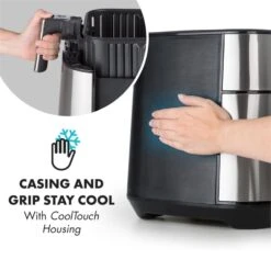 Von außen ist das Edelstahl-Gehäuse der Fritteuse nicht nur schön anzuschauen: Nach der Zubereitung ist das Gerät innen wie außen schnell wieder gesäubert. Zudem sind alle nicht-elektronischen Teile spülmaschinengeeignet.