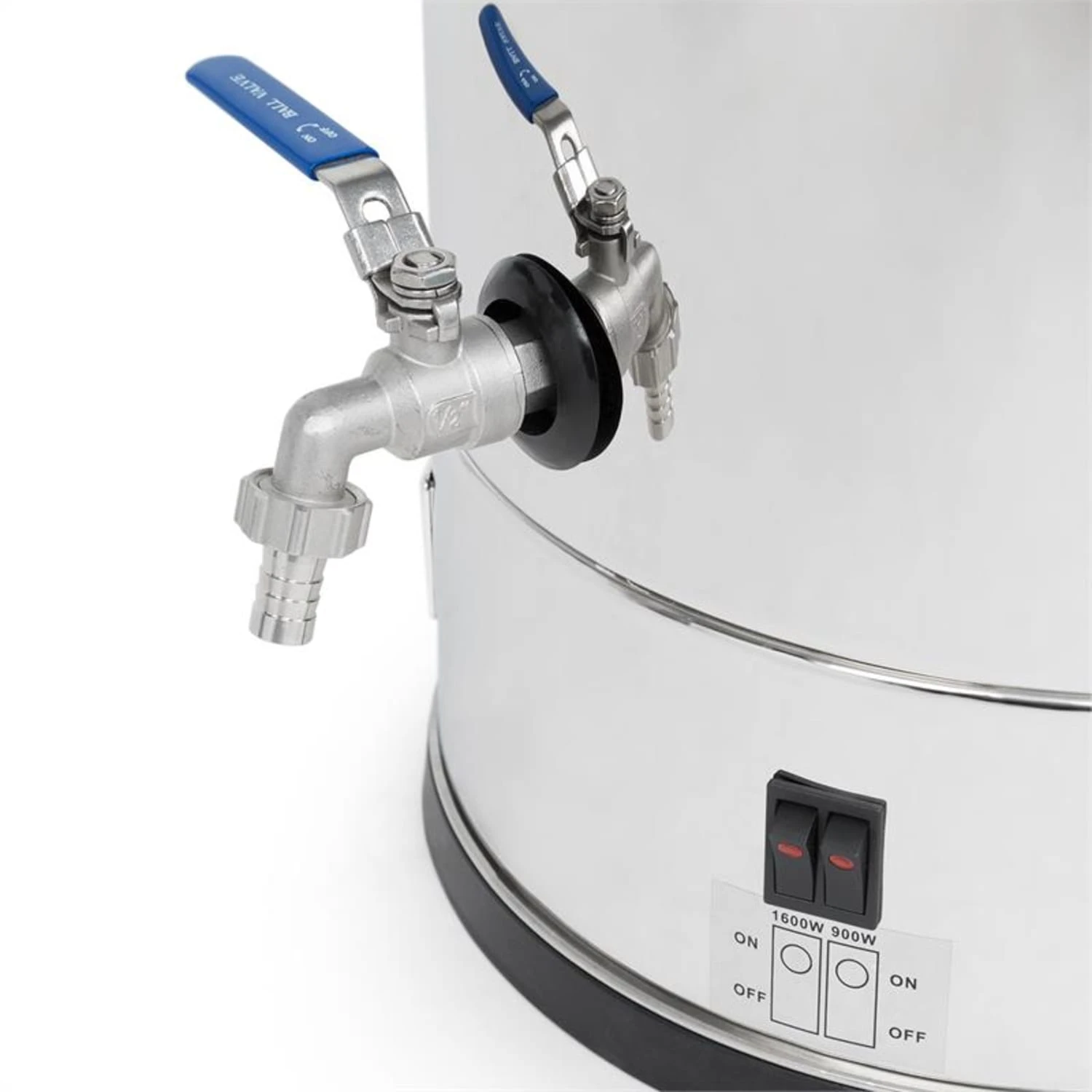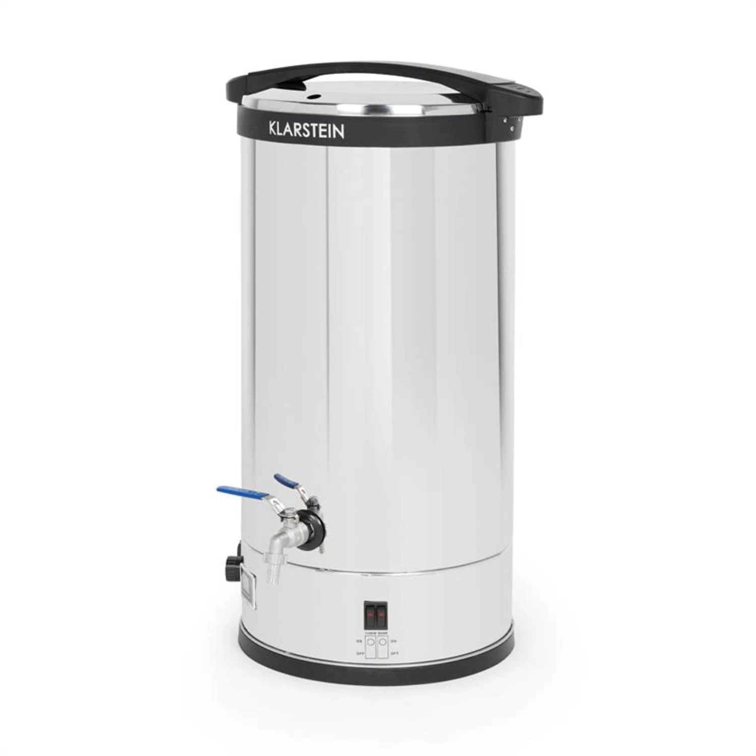 Egal ob Einsteiger oder versierter Hobby-Brauer, der Klarstein Füllhorn Maischekessel macht das Ansetzen der Braumaische zum Kinderspiel. Bis zu 30 Liter Braugut können in dem doppelwandigen Edelstahlkessel zum Kochen gebracht werden. Über zwei Drehregler mit LED-Display lassen sich manuell Temperatur und Kochzeit genau einstellen. Das 2500 W starke Heizelement bringt die Maische in Wallung. Es erreicht die gewünschten Temperaturen praktisch im Handumdrehen und hält sie dann über Stunden hinweg bei konstanten Temperaturen. Für sparsamen Energieverbrauch kann dann – je nach Füllstand des Kessels – die Leistung auf 900 oder 1600 Watt verringert werden. Eine 15-mm-Öffnung im Deckel kann zum Anschluss einer Umwälzpumpe genutzt werden.
