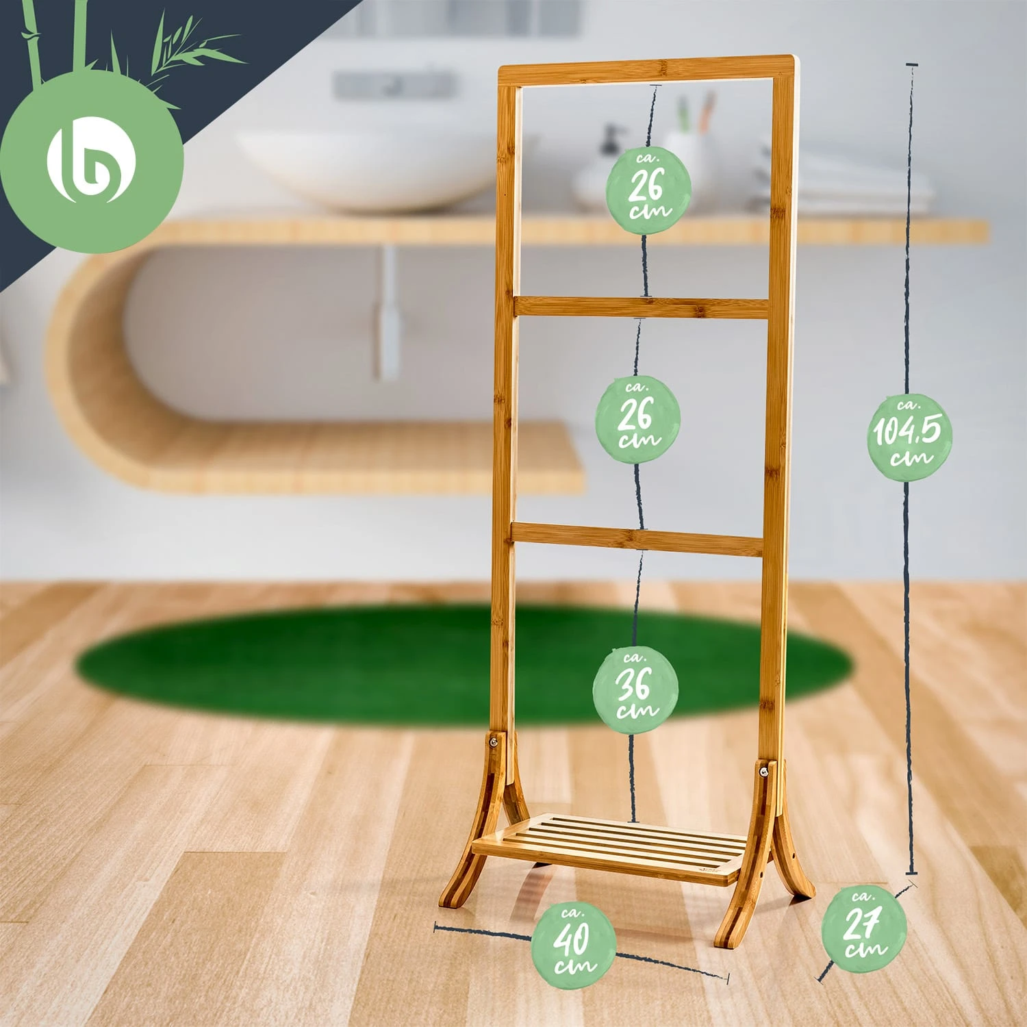 Das Besondere: die einzigartige Optik im Leiterdesgin! 3 unterschiedliche Handtuchstangen fügen sich hier akkurat zu einem Handtuchständer zusammen, verbunden durch die seitlichen Streben. Hier ist ausreichend Platz für kleine und große Badetücher geboten. Du kannst sie ideal ausbreiten, wodurch sie schnell und faltenlos trocknen. Die unterschiedlichen Höhen der Sprossen sorgen auch für Komfort. Denn die aufgehängten Badetücher kannst du so komfortabel mit nur einem Griff erreichen. Derweil bietet dir die untere Ablagefläche praktischen Platz: für Badeschuhe oder weitere Badezimmer-Utensilien.