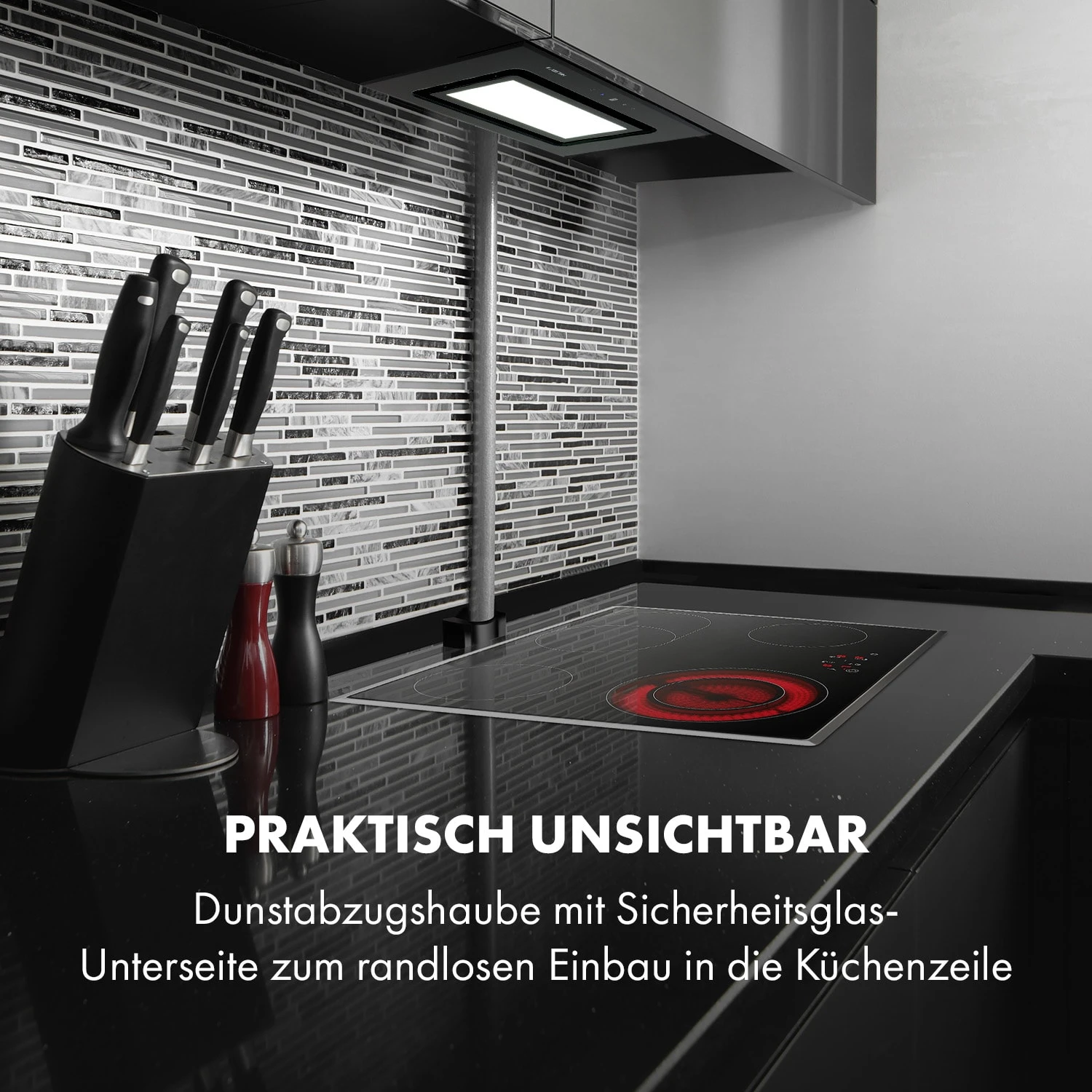 Beste Luft in deiner Küche: Der Klarstein Hektor Brilliant Edition Lüfterbaustein muss sich zwar nicht verstecken, tut es aber deiner Küchenzeile zuliebe und verschwindet randlos in der Küchenhänge. Von dort beseitigt er schwungvoll Dampf und Dunst beim Kochen.
