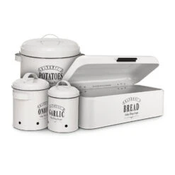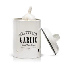 Der platzsparende Emaille-Knoblauchtopf Montana von Klarstein im Vintage-Design der 40er Jahre mit der Aufschrift „GARLIC“ ist nicht nur sehr stabil und groß genug für die Knoblauchlagerung von ca. 1,2 kg, sondern auch ein absoluter Blickfang in jeder Küche. Was oft vergessen wird: Knoblauch ist vor allem dann lange haltbar, wenn er dunkel und bei leichter Luftzirkulation gelagert wird. Durch die kleinen Lüftungslöcher im Knoblauchbehälter wird die Keimbildung verhindert und die Knoblauch-Zwiebel bleibt länger frisch. Die Aufbewahrungsbox kann selbstverständlich auch für die Lagerung von anderem Gemüse verwendet werden und lässt sich schnell und einfach mit einem feuchten Tuch reinigen. Mit einem Durchmesser von 12 cm und einer Höhe von 18 cm passt diese Knoblauchaufbewahrung im Landhaus-Stil bequem auf dein Sideboard, deine Küchenzeile oder in den Küchenschrank. Das stabile rostfreie Emaille-Stahlblech ist sehr robust und kann – anders als Steingut oder Porzellanbehälter – den ein oder anderen unabsichtlichen Sturz überstehen.