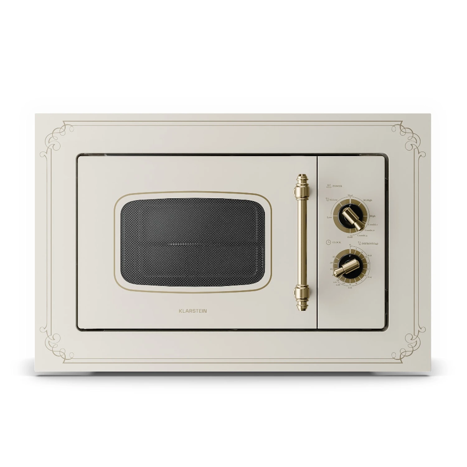 Die Klarstein Victoria 20 Einbau-Mikrowelle inklusive Einbaurahmen ist ein leistungsstarkes Allround-Talent für Single- und Familienhaushalte, das Mikrowelle und Grill zu einem multifunktionalen Gerät vereint. 800 W Mikrowellenleistung und ein 20 Liter Garraum passen das Gerät perfekt an die Bedürfnisse unserer schnelllebigen Zeit an: In 5 Stufen kann die Leistung bequem per Handgriff eingestellt werden, um in kürzester Zeit Fertigmahlzeiten zu erhitzen, Gerichte zu garen oder Zubereitetes warm zu halten. Für optimale Ergebnisse auf dem 24,5 cm Ø Glasteller wird neben der Leistungsstufe auch die Garzeit im wortwörtlichen Handumdrehen bequem reguliert. Nach deren Ablauf stoppt die Einbau-Mikrowelle und macht mit einem Signalton auf sich aufmerksam. Auf diese Weise geraten zubereitete Speisen nicht in Vergessenheit und knurrende Mägen werden rechtzeitig gefüllt. Zusätzlich besitzt die Victoria 20 einen hitzigen 1000 W Grill, der dank eines mitgelieferten Grillgitters Würstchen und Fleisch in kürzester Zeit die rechte Bräune verleiht: einfach die Grillfunktion oder per QuickSelect die gewünschte Kombination aus Grill- und Mikrowellenhitze auswählen und das Brutzelvergnügen beginnen lassen! Zum Auftauen tiefgefrorener Lebensmittel bietet die Klarstein Einbau-Mikrowelle außerdem eine Auftau-Funktion an, die es zum Kinderspiel macht, Fleisch, Geflügel oder Meeresfrüchte zu enteisen, ohne sie ungewollt durchzukochen. Im Inneren des Gerätes funkelt ein SimpleClean-Edelstahl-Interieur, das besonders resistent und einfach zu reinigen ist. Auch äußerlich macht die Victoria 20 Einbau-Mikrowelle ihrem Namen alle Ehre und besitzt ein elegantes, an das 19. Jh. angelehntes Retro-Gehäuse, das sich widerspruchslos in jedes moderne und klassische Küchenensemble einfügt.